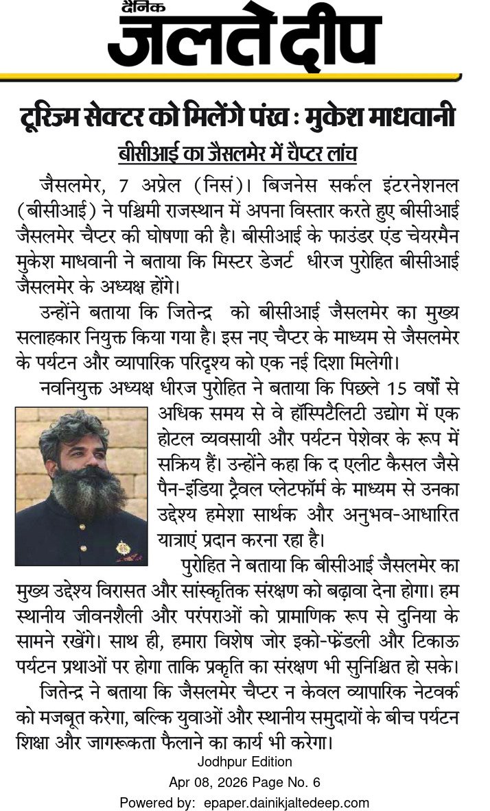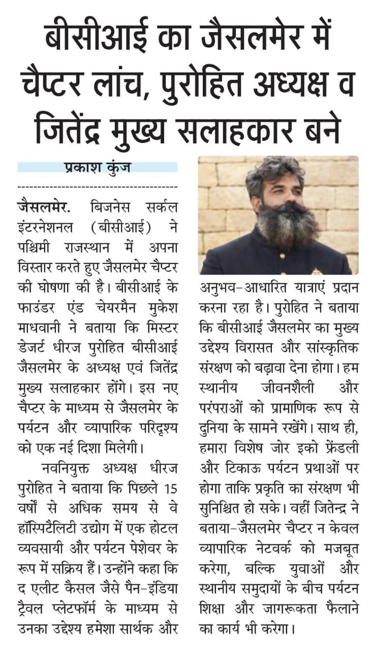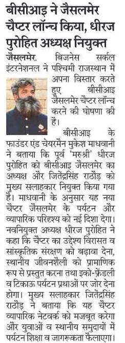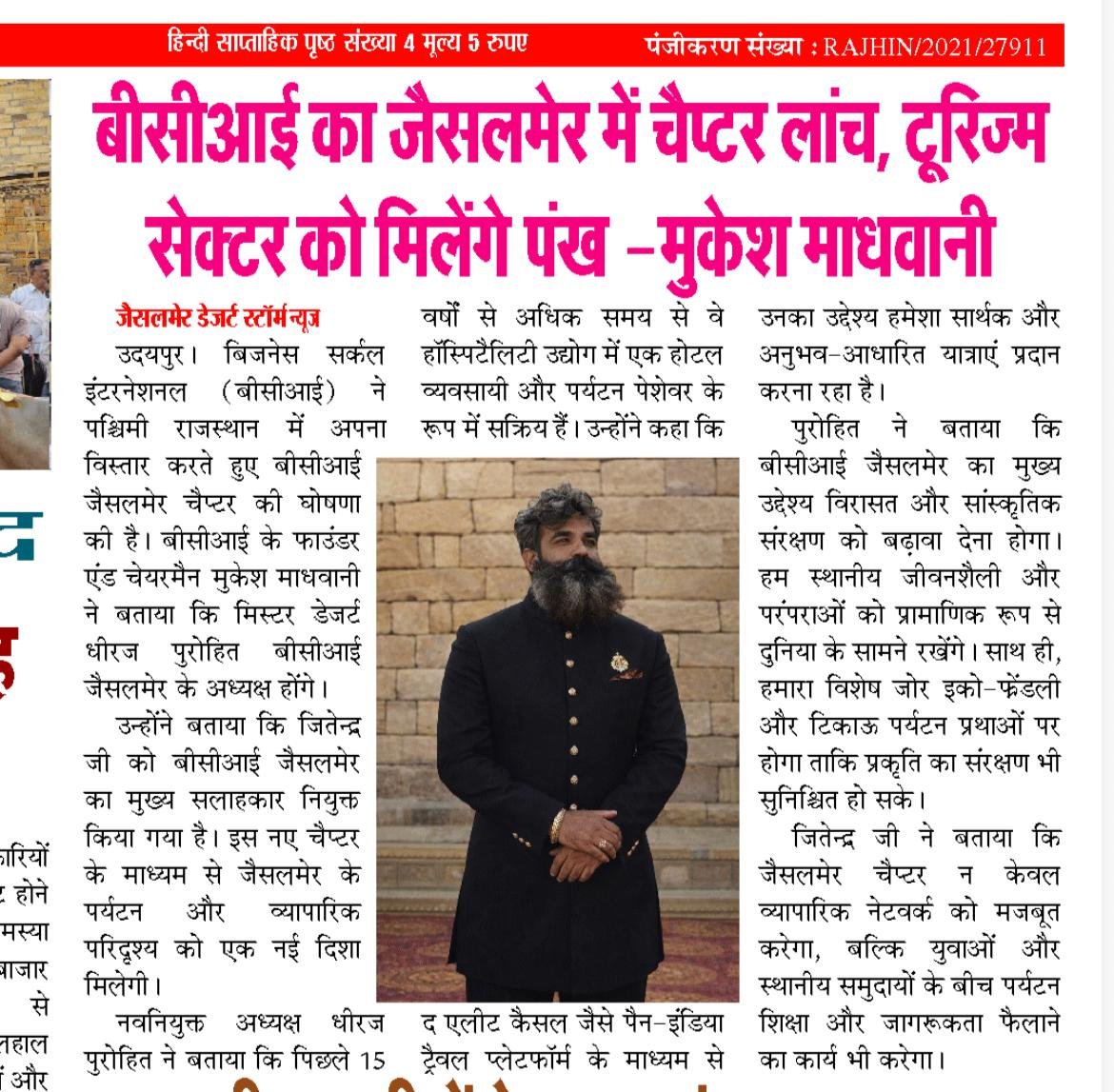 Business Circle International (BCI) has expanded into western Rajasthan with the launch of its BCI Jasalmer Tourism Chapter. BCI Founder and Chairman Mukesh Madhwani announced that Mr. Dheeraj Purohit will serve as the President of BCI Jasalmer.