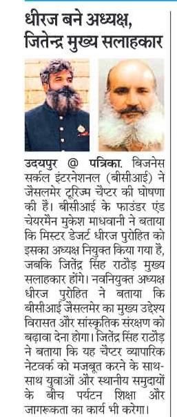 Jitendra Singh Rathore has been appointed as the Chief Advisor for the new chapter. Through this initiative, the tourism and business landscape of Jasalmer is expected to receive fresh momentum.